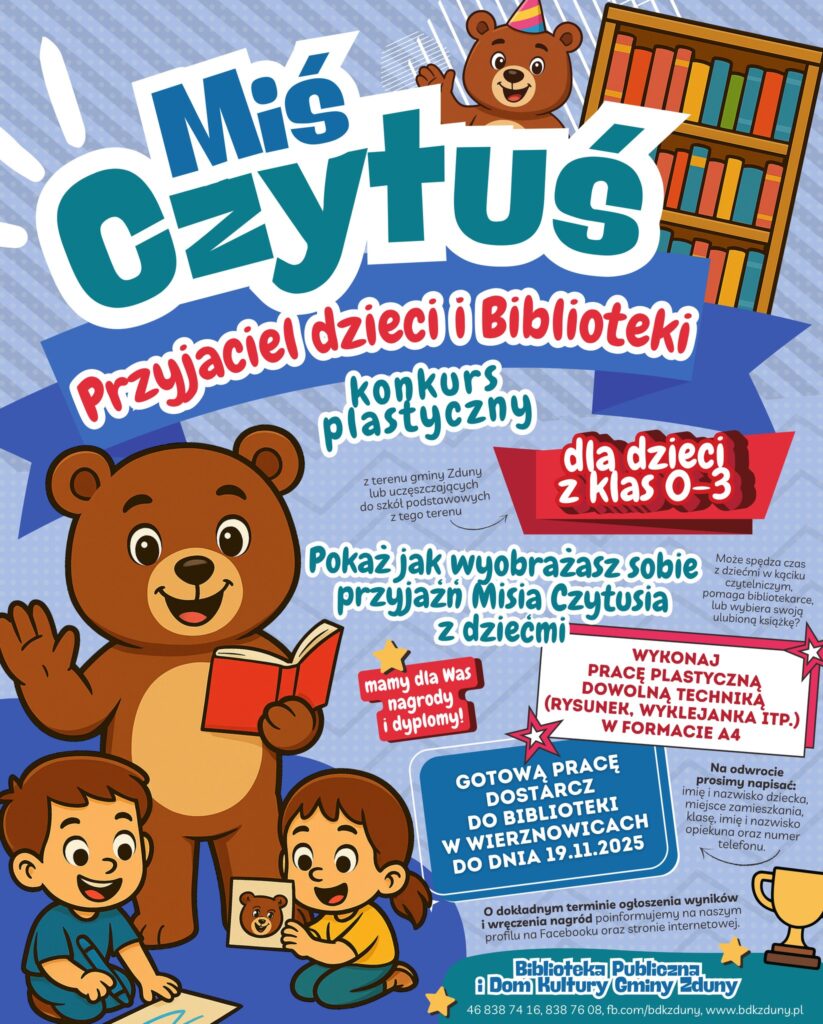 Przy okazji dzisiejszego Dnia Postaci z Bajek, a także zbliżającego się Dnia Pluszowego Misia (25 listopada), zachęcamy wszystkie dzieci do udziału w wyjątkowym, kolorowym konkursie plastycznym „Miś Czytuś – przyjaciel dzieci i biblioteki”.