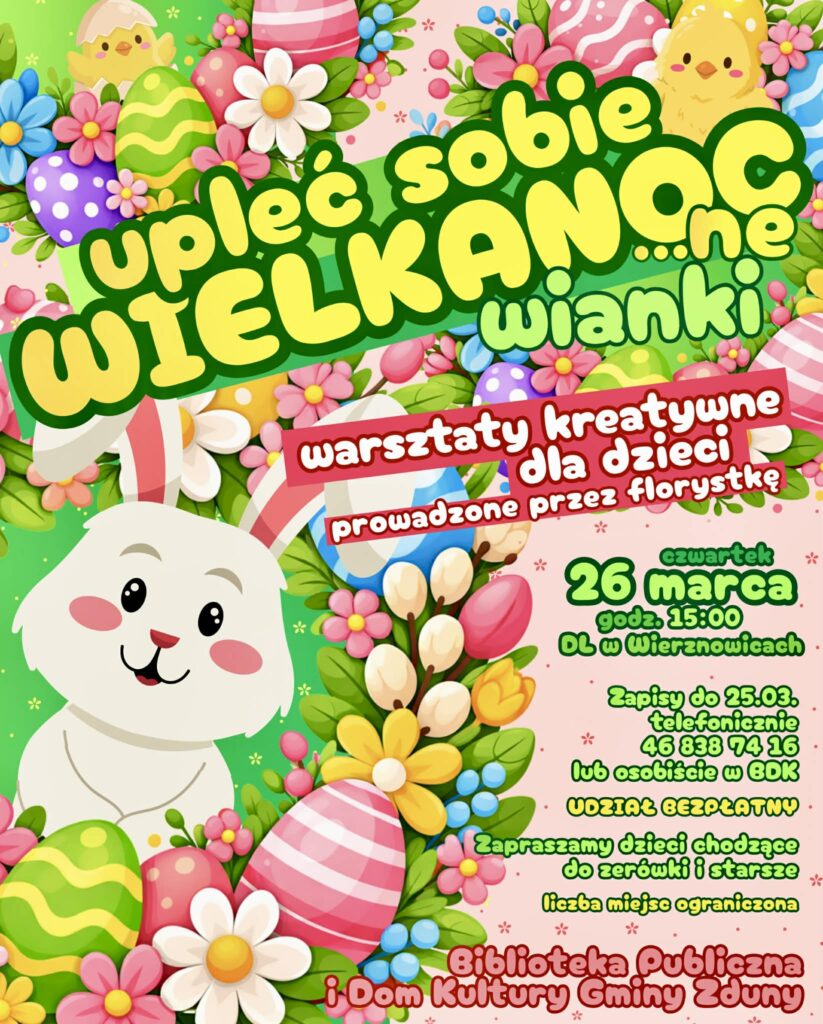 Już w następny czwartek, tj. 26 marca o godz. 15:00 spotkamy się w Domu Ludowym w Wierznowicach, aby wspólnie przygotować piękne, wiosenno-świąteczne dekoracje. Warsztaty poprowadzi florystka, która wprowadzi dzieci w świat twórczej pracy z kwiatami i ozdobami wielkanocnymi. Podczas zajęć wykorzystamy naturalne materiały, z których powstaną wyjątkowe, własnoręcznie wykonane wianki.